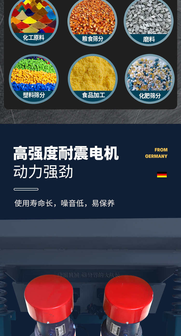 是以利用振动电机激振作为振动源,使物料在筛网上被抛起,同时受力向前做直线规则运动,物料从给料机均匀地进入筛分机的进料口,通过多层筛网产生数种规格的筛上物、筛下物、从各自的出口排出。具有耗能低、产量高、结构简单、易维修、全封闭结构,无粉尘溢散,自动排料, 更适合于高产能流水线作业。