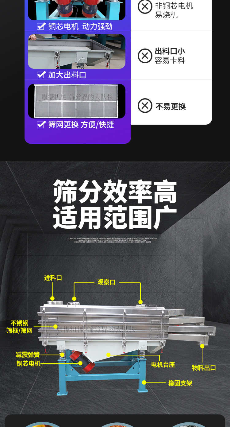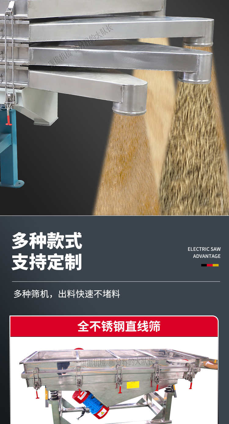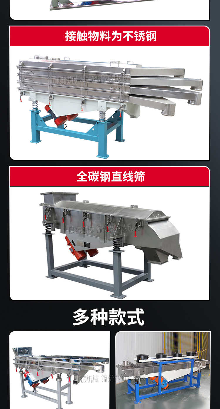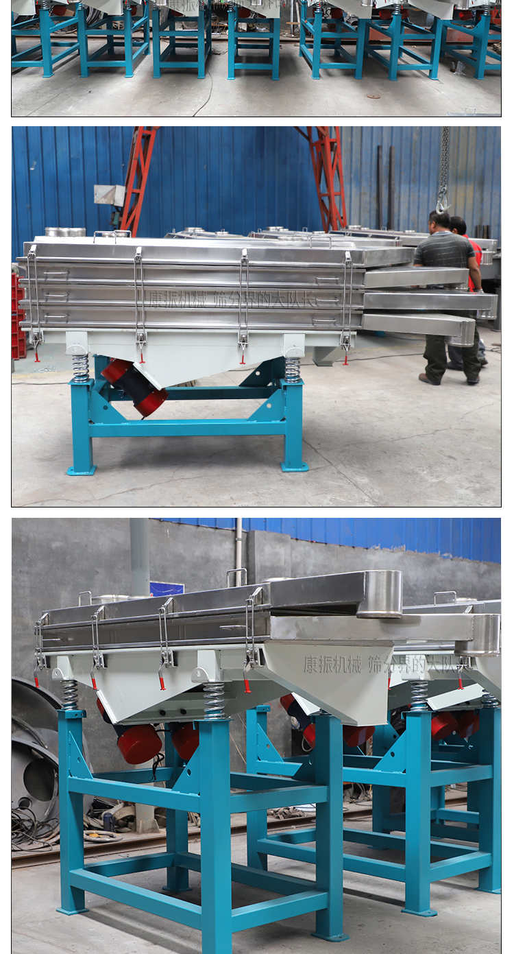直线振动筛(直线筛)稳定可靠、消耗少、噪音低、寿命长、振型稳、筛分效率高等优点。