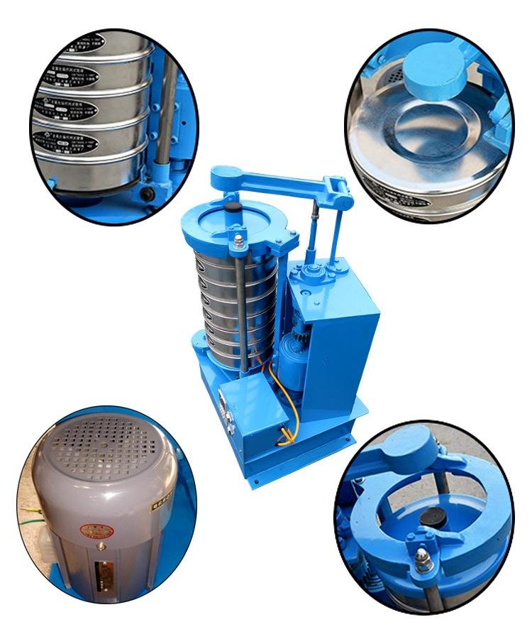 电机带动齿轮通过同步带传动到主轴上,经齿轮变速后主轴按要求的转速转动,主轴带动偏心轮使滑板做往复运动,带动安装在滑板托盘中的试验筛左右摇动,同时主轴带动顶杆齿轮转动,变速后顶杆齿轮通过凸轮顶击顶杆,顶杆使拍锤上下拍击试验筛上盖,使得试验筛、分样筛中的物料往复和上下振动,使小于试验筛的筛面网孔的物料颗粒筛分进下层试验筛,如此层层筛选,使每层试验筛内只留相同粒度的物料。达到不同粒度的分离并确定此物料的粒度组成。