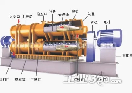 双圆筒依靠联接板固定成一体,联接板上同时固定着激振器,且激振器需通水冷却,双圆筒由隔振弹簧支承,弹簧支座固定在不参振的底架上。圆筒筒体由外筒、内衬筒和端盖组成。内衬筒是可更换的,由耐磨材料制成。 ZM系列振动磨的激振器由四组主副偏心块组成,调整副偏心块和主偏心块的相位角,可改变激振力的大小,从而达到调整振幅大小的目的,振动磨双振幅的近似值可以从振幅标示牌上读出。圆筒内的粉磨介质有钢球或钢棒两种。相同直径和级配的情况下,钢棒做介质时的产率要高于钢球做介质时的产率。因为用钢球做介质时,要达到同样的粉状粒度,粉磨时间较长,但钢球做介质时能达到更细的粒度。振动磨常用介质为Φ16-Φ36mm的钢棒,钢棒应经过渗碳和淬火,表面硬度应达到HRC55以上。入料粒度>15mm时取较大直径,入料粒度<15mm时取较小直径,并采用两种不同直径钢棒的混合级配较好。