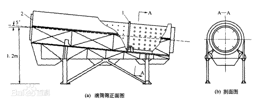 滚筒装置倾斜安装于机架上。电动机经减速机与滚筒装置通过联轴器连接在一起,驱动滚筒装置绕其轴线转动。当物料进入滚筒装置后,由于滚筒装置的倾斜与转动,使筛面上的物料翻转与滚动,使合格物料(筛下产品)经滚筒后端底部的出料口排出,不合格的物料(筛上产品)经滚筒尾部的排料口排出。由于物料在滚筒内的翻转、滚动,使卡在筛孔中的物料可被弹出,防止筛孔堵塞。滚筒筛砂机、滚筒筛分机与滚筒筛的原理构造几乎相同,是人们对它的认识和叫法上存在差异。