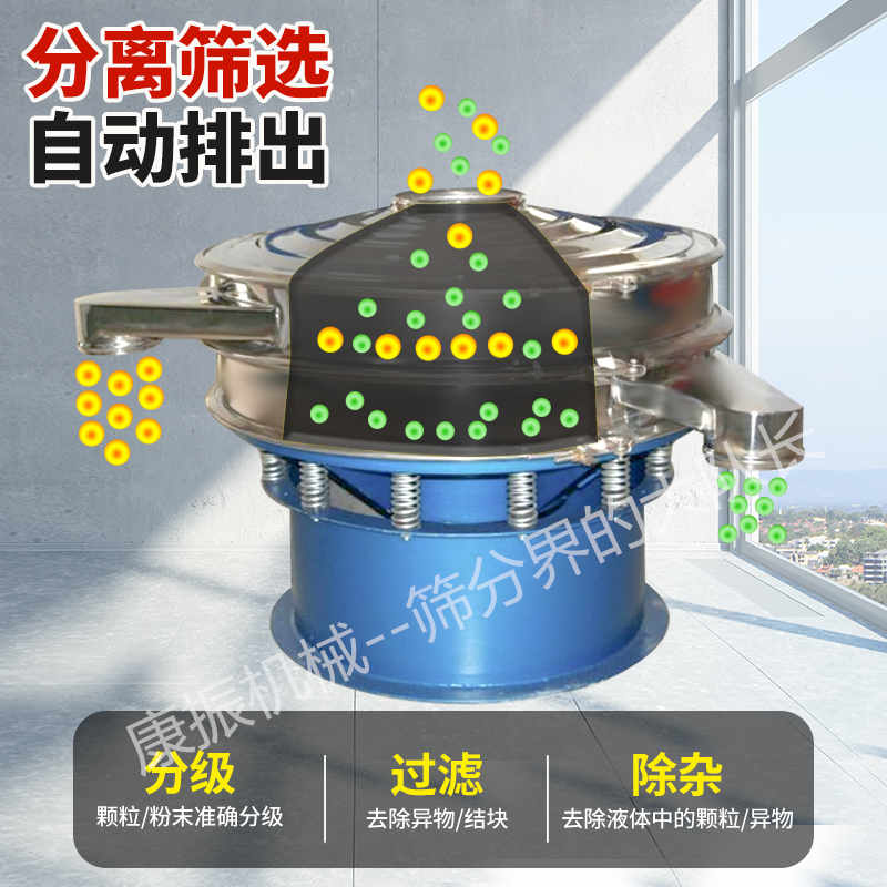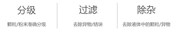 任何颗粒、粉末、粘液一定范围内均可筛选。筛分细至500目或0.028mm, 过滤小可至5微米。分级筛选,可筛一至五层筛网,能同时进行二至六个等级的分选或过滤。