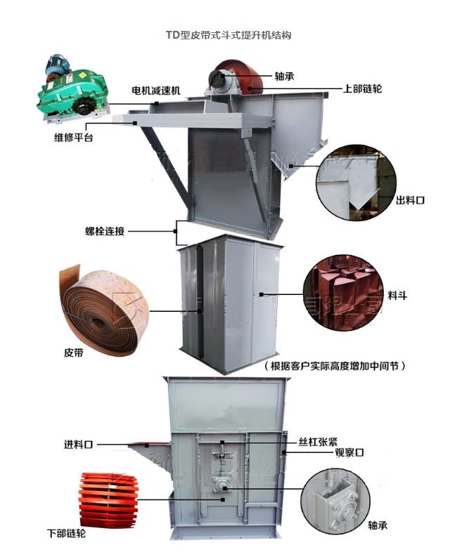 TD型斗式提升机由运行部分(料斗与牵引胶带),带有传动滚筒的上部区段、带有拉紧滚筒的下部区段、中间机壳、驱动装置、逆止制动装置等组成。适用于向上输送松散密度ρ<1.5t/m3粉状、粒状和小块状的无磨琢性和半磨琢性散状物料,如煤、砂、焦末、水泥、碎矿石等。另一种钢丝绳芯胶带斗式提升机,由于它的牵引构件为钢丝绳芯胶带所以比TD型的橡胶带具有更好的耐磨抗拉效果。