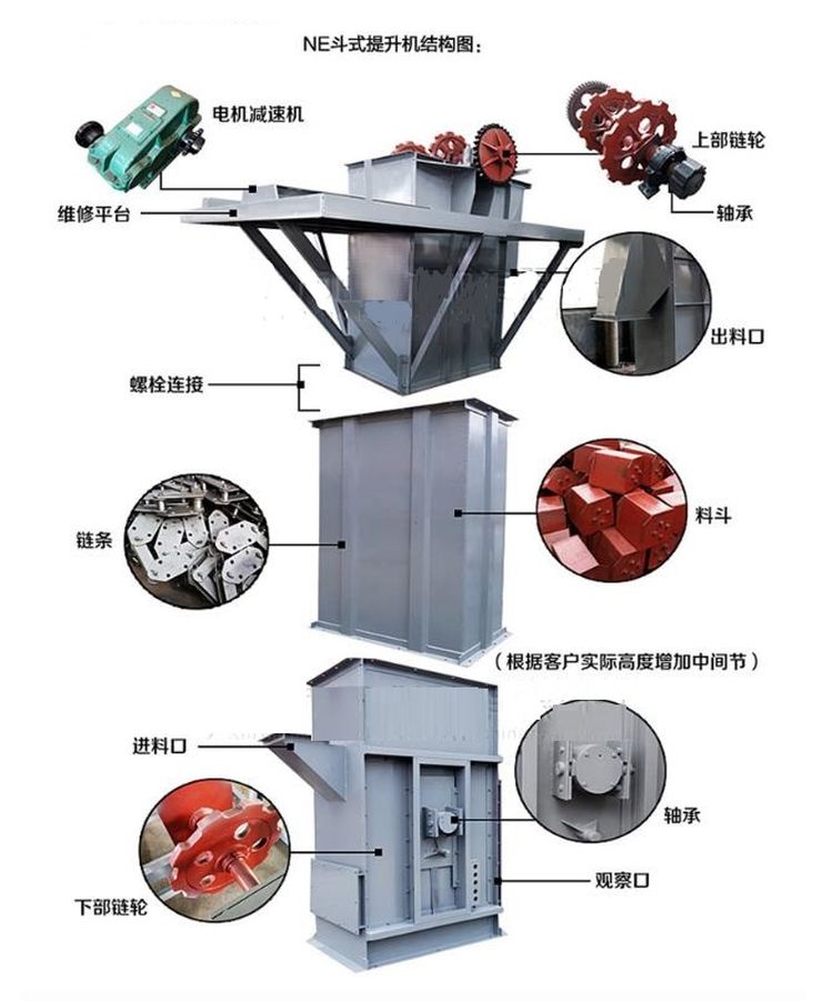 是一种新型的斗式提升机,其采用板链传动,区别于老型号TB系列板链斗式提升机,其命名方式采用提升量而命名而非斗宽。如NE150指的是提升量为150吨一小时而不是斗宽150。NE系列斗式提升机有着很高的提升机效率,根据提升速度不同还分有NSE型号及高速板链斗式提升机。