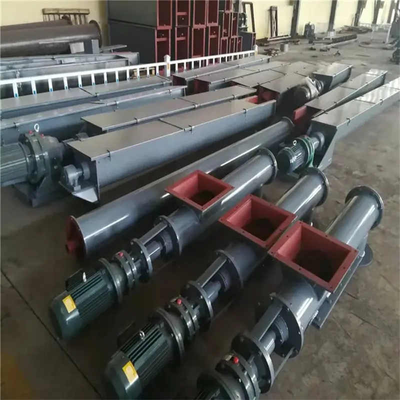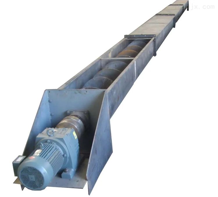 LS型螺旋输送机结构特征,一台螺旋输送机通常由本体、进出装置、驱动装置三大部分组成。本体由首节、中间节、尾节三种组成。在首节内装有支推轴承承受轴向力,在中间节和尾节内装有用轴承支承螺旋轴,此外,在尾节内还装有可轴向移动的径向轴承以补偿螺旋轴长度的误差和适应温度的变化。各螺旋轴之间采用法兰式联接,提高联接轴的互换性,便于维修。