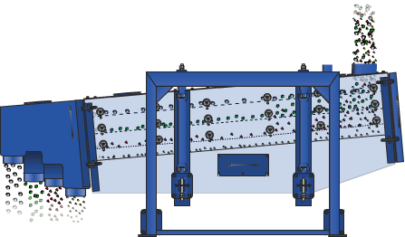 设备的筛箱在惯性力的作用下作前后往复运动,并带动筛面做周期性摇动,迫使筛面上的物料随筛箱一同做定向跳跃式运动,小于筛面孔径的物料通过筛框落到下层,称为筛下物,大于筛面孔径的物料经连续翻滚跳跃运动后从排料口排出,完成筛分作业。