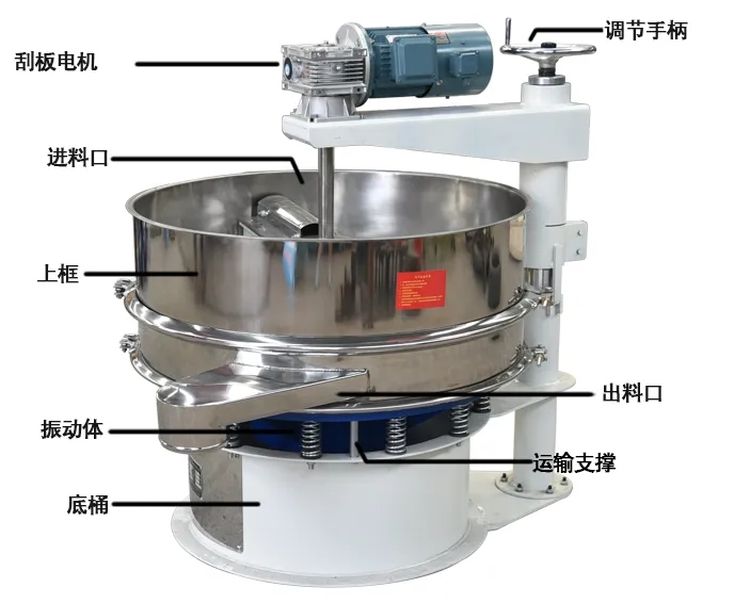 便于加强振动筛筛网的自清洁功能,例 如在面粉筛分中,有些细渣子易于掉落在网孔中,在刮板旋转推动的作用下,