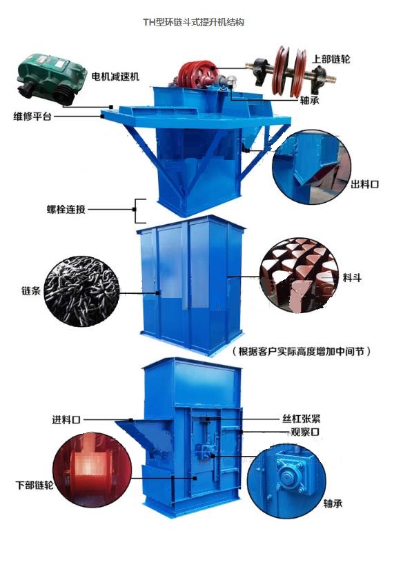 TH型圆环链斗式提升机是一种圆环链斗式提升机采用混合式或重力卸料,挖取式装料。牵引件用优良合金钢高度圆环链。中部机壳分单、双通道两种形式为机内重锤箱恒力自动张紧。链轮采用可换轮缘组合式结构。使用寿命长,轮缘更换工作简便。下部采用重力自动张紧装置,能保持恒定的张紧力,避免打滑或脱链,同时料斗遇到偶然因素引起的卡壳现象时有一定的容让性,能够有效地保护下部轴等部件。