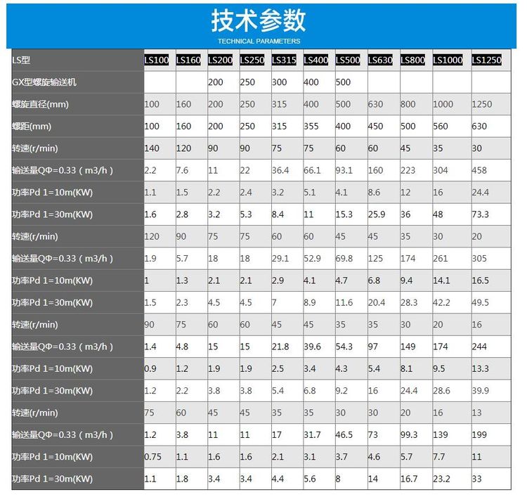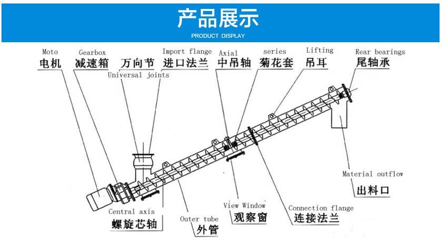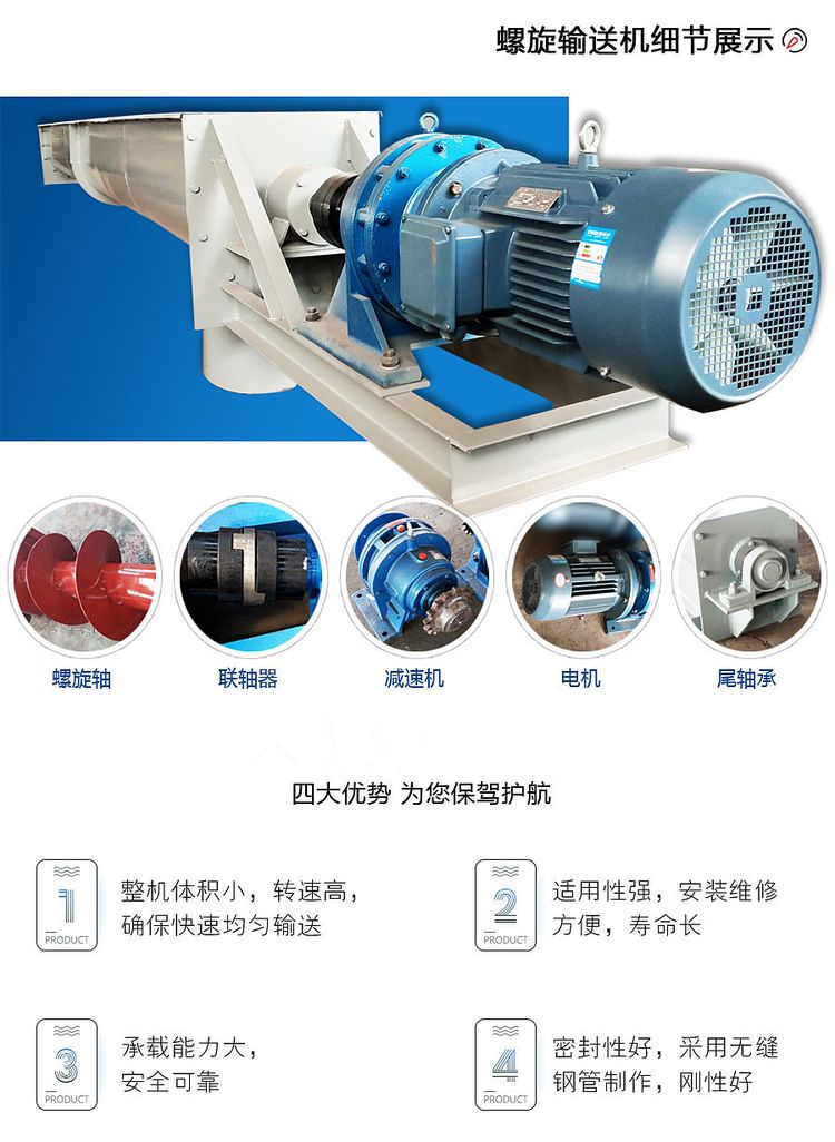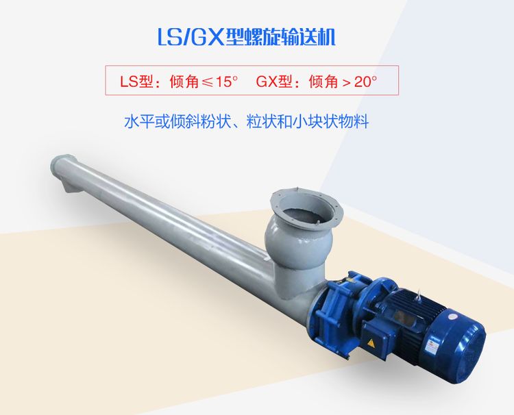 LS型螺旋输送机结构特征,一台螺旋输送机通常由本体、进出装置、驱动装置三大部分组成。本体由首节、中间节、尾节三种组成。在首节内装有支推轴承承受轴向力,在中间节和尾节内装有用轴承支承螺旋轴,此外,在尾节内还装有可轴向移动的径向轴承以补偿螺旋轴长度的误差和适应温度的变化。各螺旋轴之间采用法兰式联接,提高联接轴的互换性,便于维修。