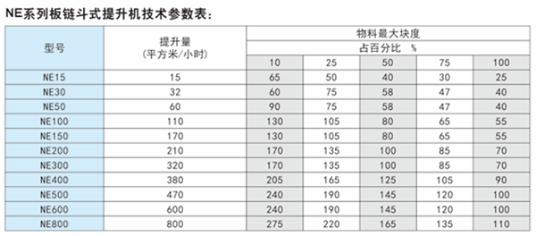 NE系列板链斗式提升机是一种新型的斗式提升机,其采用板链传动,区别于老型号TB系列板链斗式提升机,其命名方式采用提升量而命名而非斗宽。如NE150指的是提升量为150吨一小时而不是斗宽150。NE系列斗式提升机有着很高的提升机效率,根据提升速度不同还分有NSE型号及高速板链斗式提升机。