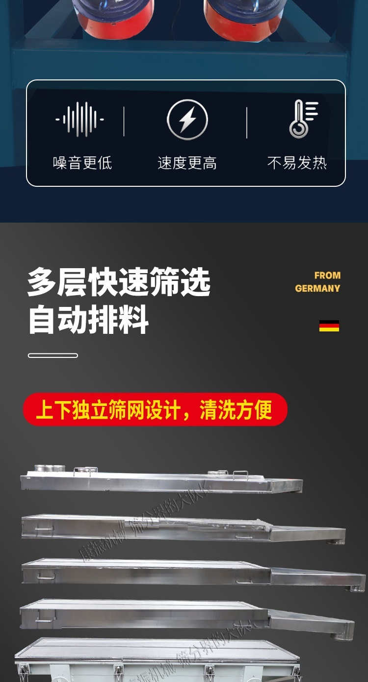 是以利用振动电机激振作为振动源,使物料在筛网上被抛起,同时受力向前做直线规则运动,物料从给料机均匀地进入筛分机的进料口,通过多层筛网产生数种规格的筛上物、筛下物、从各自的出口排出。具有耗能低、产量高、结构简单、易维修、全封闭结构,无粉尘溢散,自动排料, 更适合于高产能流水线作业。