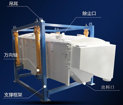 3、方形摇摆筛结构采用全封闭式,保证物料不外出,用偏重平衡的设计,减少筛机的振动,降低噪声;