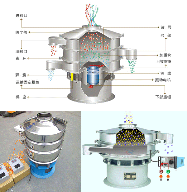 超声波筛分系统由超声波谐振电源、振荡器、共振环组成。超声波谐振电源产生的高频电振荡由振荡器转换成高频正弦形式的纵向振荡波,这些振荡波传到共振环上使共振环产生共振,然后由共振环将振动均匀传输至筛面。筛网上的物料在做低频三次元振动的同时,叠加上超声波振动,既可防止网孔堵塞,又可提高筛分产量和质量。
