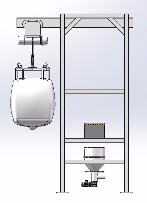主体结构:卸料站框架支撑结构、吨袋起重装置、吨袋吊架、吨袋支撑按摩板、袋口控制阀、密封装置。