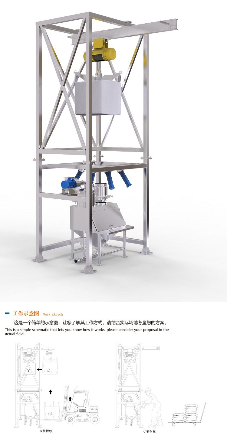 结构:吨袋卸料投料站用于吨袋装粉状、颗粒状物料拆包卸料作业。该设备由机架、提升装置、隔膜阀、暂存料仓等组成;根据工艺特点和设备尺寸,可以采用吊机和叉车两种不同的方式; 可配有双轨道,用于两只电动葫芦安装的场合中,提高拆袋效率;材质分为碳钢和不锈钢两种;整套设备密封性好,操作简便,极大的提高了生产环境和生产效率。