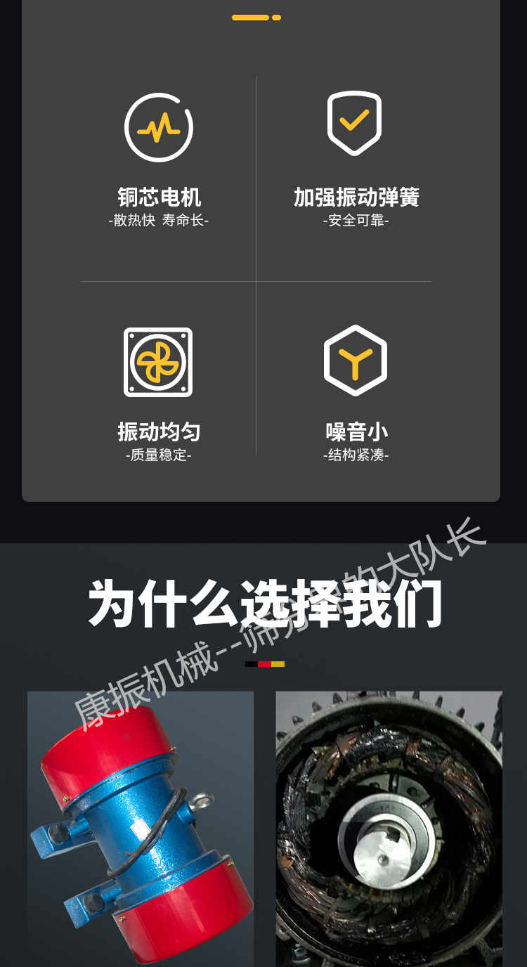 2、振荡电机为激振源,噪声低、耗电小、保护简略。